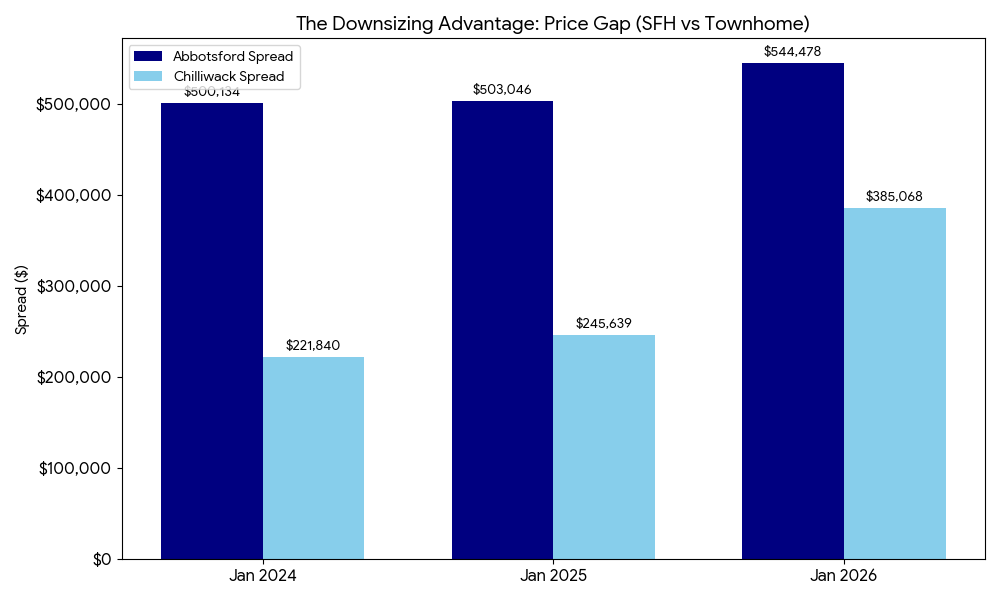 If you are planning to sell a Townhome to buy a Detached House, be aware that the "bridge" has gotten longer. Because strata properties have softened faster than detached homes, the price gap you need to cover is significantly larger than it was in 2024.