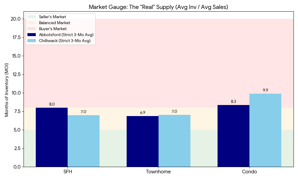 To get the most honest reading of the market, we calculated the Months of Inventory (MOI) using a strict 3-month average for both active listings and sales. This prevents the "December Dip" (when listings expire) from artificially making the market look tight.