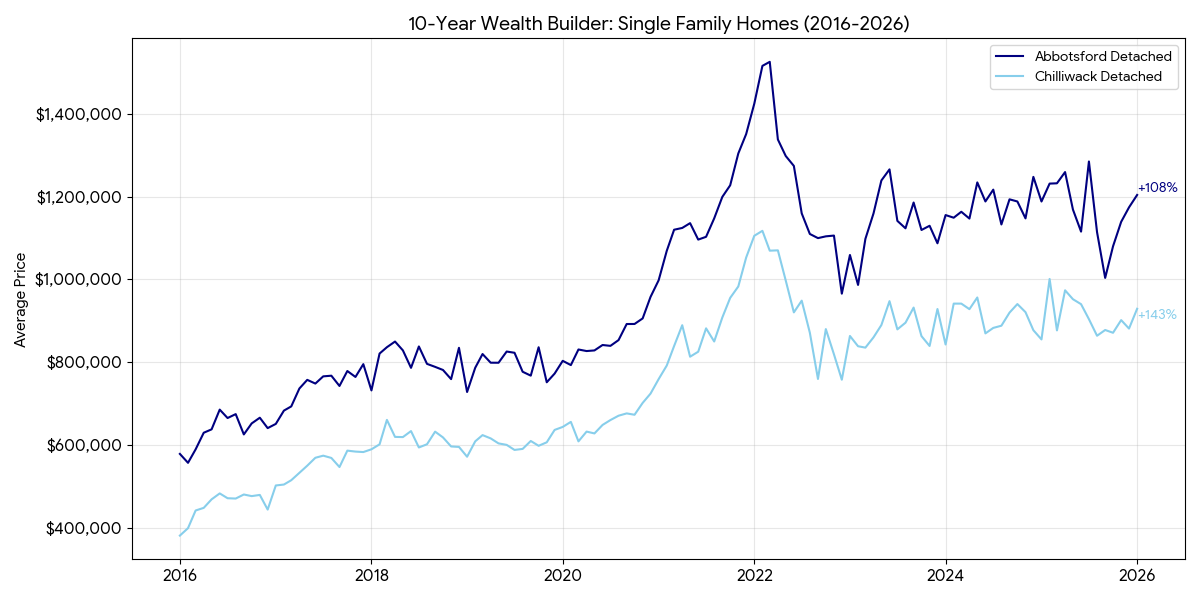 Real estate remains a long game. Despite the recent flat period, the 10-year trend line confirms that holding property in the Fraser Valley is a powerful wealth builder.