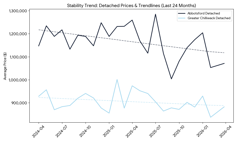 When evaluating the last two years of detached home prices on our Stability chart, you will notice clear, dotted trend lines moving slightly downward. Over the last 24 months, the trend line for Abbotsford detached homes shows a decrease of roughly 8%, while the Greater Chilliwack trend line shows a softer decline of about 3.8%.