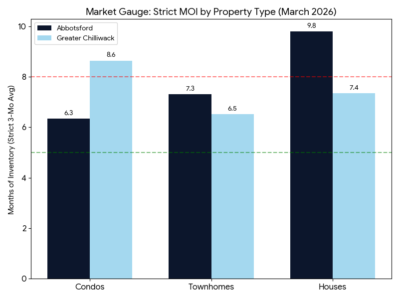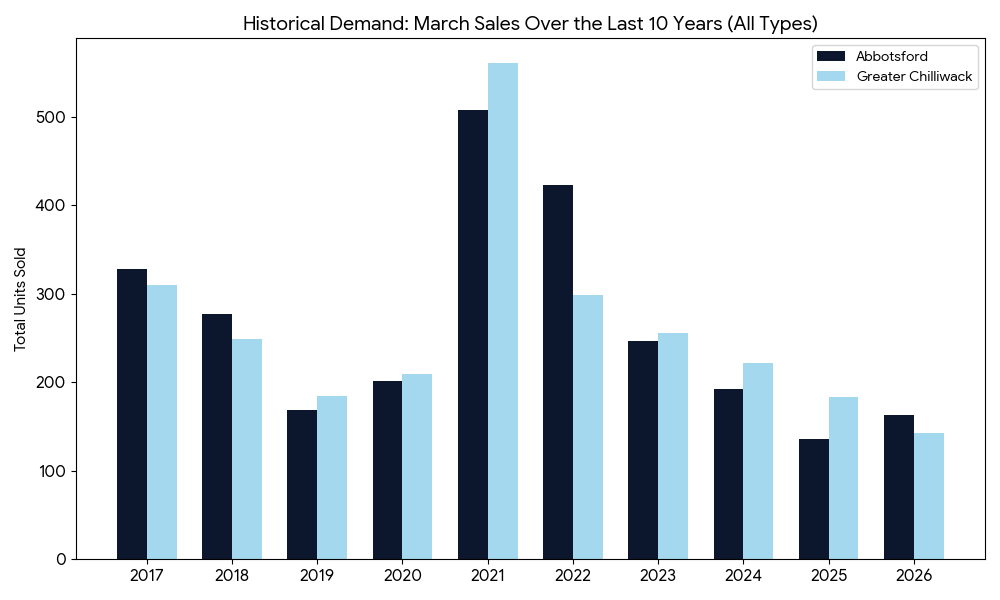To understand why the market feels so quiet, we can look at historical demand. Historically, March is the spark that ignites the busy spring real estate season. Over the last decade, Abbotsford has averaged 264 total sales in March, and Greater Chilliwack has averaged 261. This year, the spring market stayed entirely dormant. Abbotsford recorded just 163 sales, and Greater Chilliwack saw only 143. We simply do not have the typical surge of eager spring buyers right now, which is why active inventory is allowed to comfortably accumulate on the MLS.