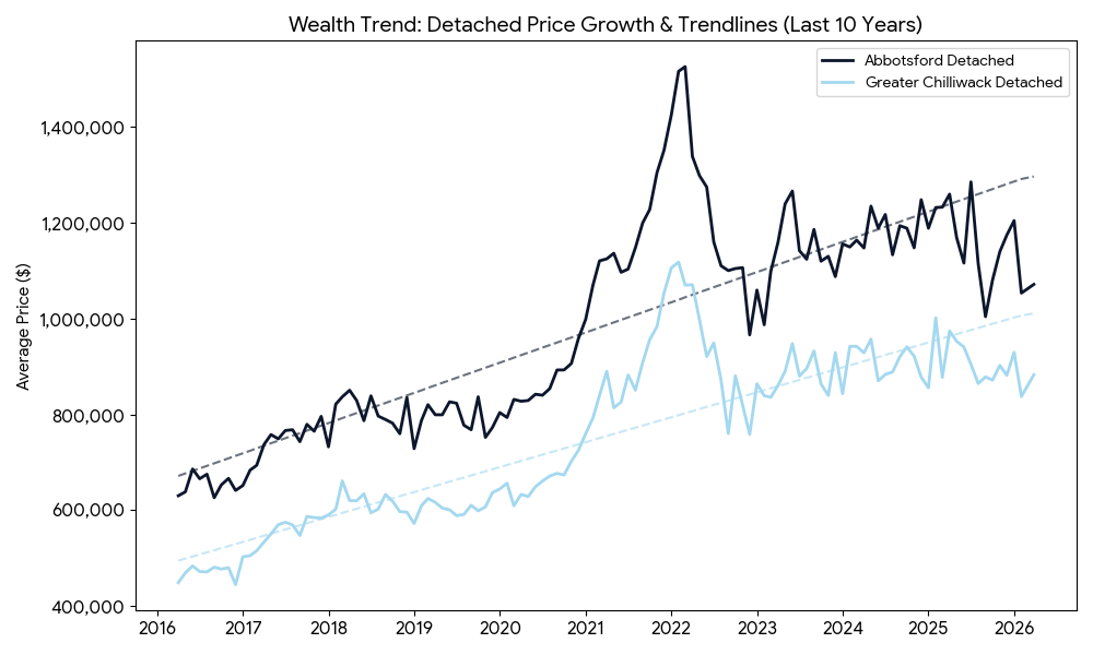 It is easy to let a quiet month or a soft quarter make you feel uncertain, but real estate rewards patience. Looking at the ten-year Wealth Trend chart, the compound growth remains staggering. A decade ago, the average Abbotsford house was valued at around $630,000. Today, it sits firmly over $1 million. The Greater Chilliwack market grew from roughly $450,000 to over $882,000. The long-term trend lines clearly point upward. If you purchase a fundamentally solid home and hold onto it, time historically does the heavy lifting for your net worth.